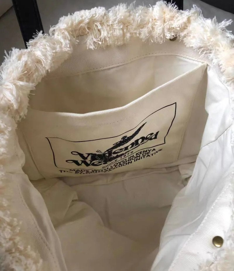 Make a bold statement with this artistic canvas tote featuring Vivienne Westwood’s iconic Saturn logo over a global map and hand-drawn activist graphics. Finished with fringe trim and contrast handles, this eco-conscious bag is both functional and fashion-forward.